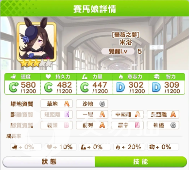 先来看看米浴角色的属性怎么样吧,对比其他角色来说,她的属性版面可以说是一团乱糟,因为偏差都很大,就像是偏科的学生一样。米浴的速度和力量天赋非常非常弱,但是耐力和毅力却强的离谱,一般来说,这种天赋偏差太大的角色是没有什么培养的前途的,但是游戏里有的模式还是需要毅力顽强的玩家,所以米浴就有了发挥的地方。在游戏的前期,玩家可以不考虑她因为前期的发展缓慢,不能够很好的培养他,到后期的时候就可以去开发她了。