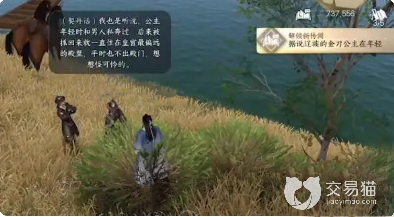 想要过这一关卡,首先要触发它的前置任务,它的前置任务在游戏当中就是:人间燕门狼烟偷听。想要过这一前置任务,首先就是要来到边境,边境的地标是[737,556],按照地标来到合适位置之后就可以偷听他们的对话了,偷听对话之后就可以触发一个传闻的线索,这是偷听到的第一个传闻。