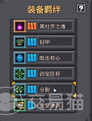 然后“锁定目标”和“分裂”最好也都凑齐,它们能保证你技能投射物的准度,还能增加投射物的数量,无论是输出的稳定性还是伤害的上限都得到显著提升,最后的“重型弹药”最好也要凑齐两件,这个可以增强投射物的伤害与击退效果,但代价是降低飞行速度,但你有锁定目标作保障,不必担心因速度变慢而导致攻击落空。